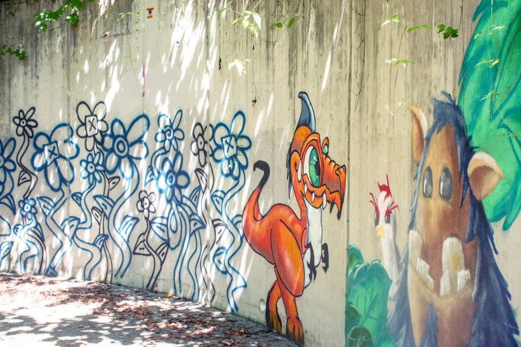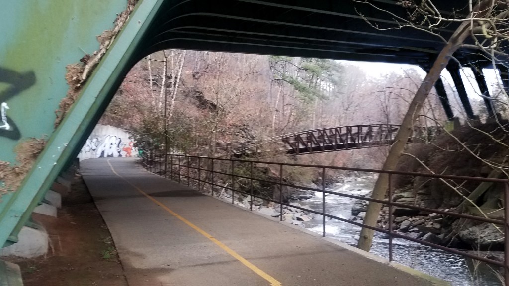 These images come from Bob Callan trail. This 3-mile paved trail feels quite urban at times as it runs under roads and past office buildings, but it also offers a remote, natural feel too . The trail parallels Rottenwood Creek to its confluence with the Chattahoochee River.