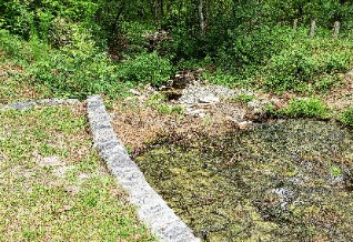 Water flows to greener ways down a path another flows hidden behind brush.