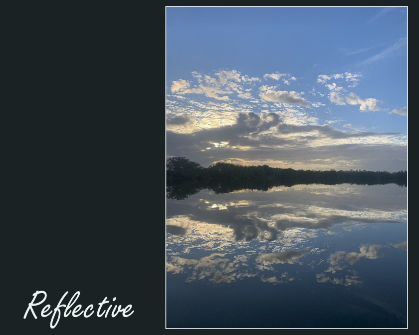 Water seems so still, trapped in time caught in the past surrounded by trees. Manmade lake – lone, white pipe marks the well dug and abandoned. Water flows and flows, never ending like the changing seasons. Warm spring breeze kisses the water’s top. Trees caught and mirrored back. Blue skies seen below the surface.